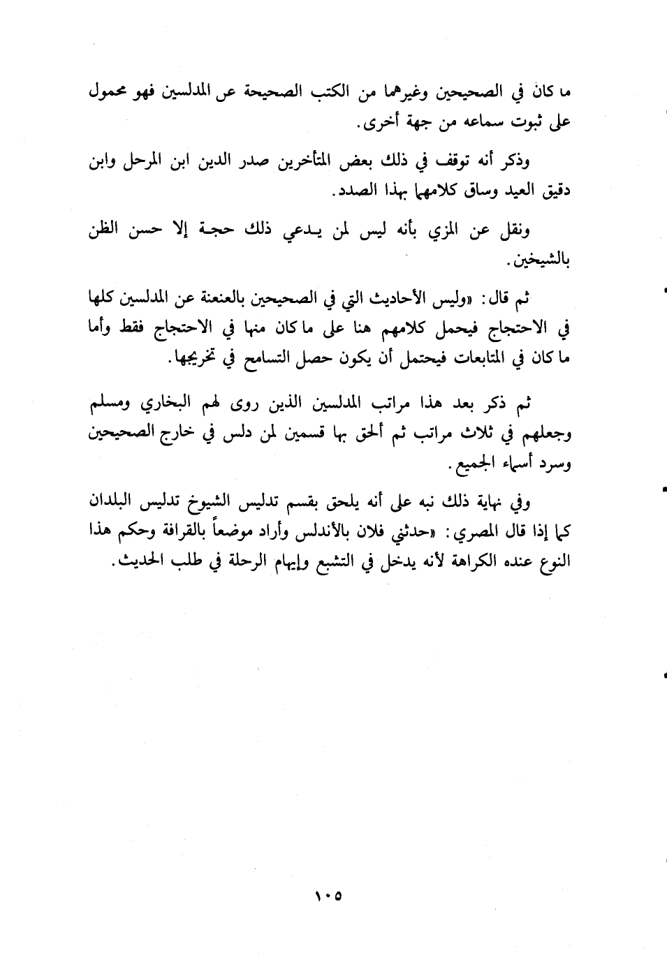 ثم قال: "وليس الأحاديث التي في الصحيحين بالعنعنة عن المدلسين كلها في الاحتجاج، فيحمل كلامهم هنا على ما كان منها في الاحتجاج فقط، وأما ما كان في المتابعات فيحتمل أنه حصل التسامح في تخريجها"