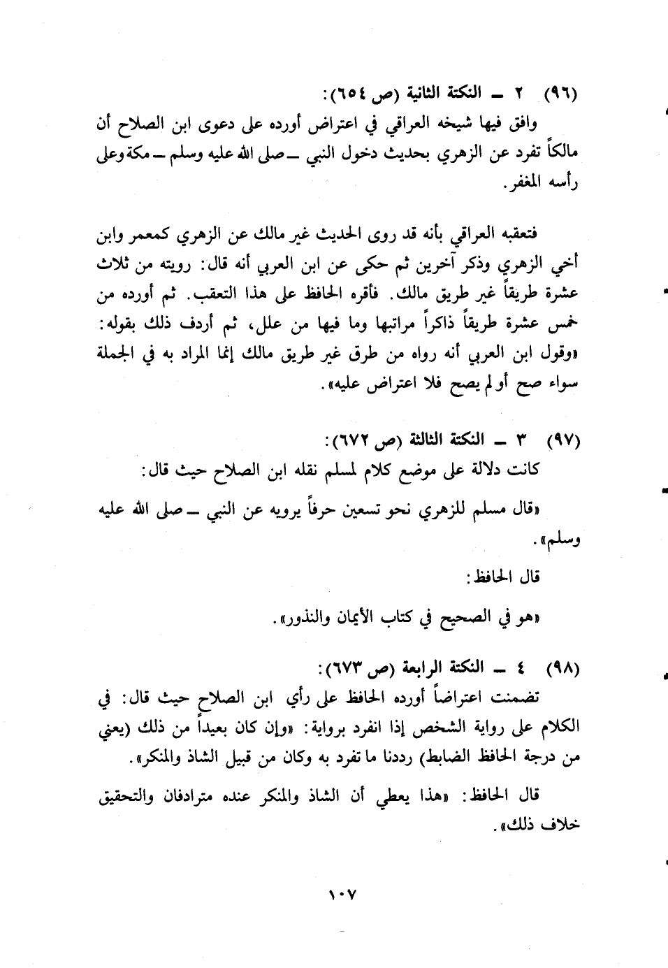 تضمنت اعتراضا أورده الحافظ على رأي ابن الصلاح حيث قال: في الكلام على رواية الشخص إذا انفرد برواية: "وإن كان بعيدا عن ذلك (يعني من درجة الحافظ الضابط) رددنا ما تفرد به وكان من قبيل الشاذ والمنكر".