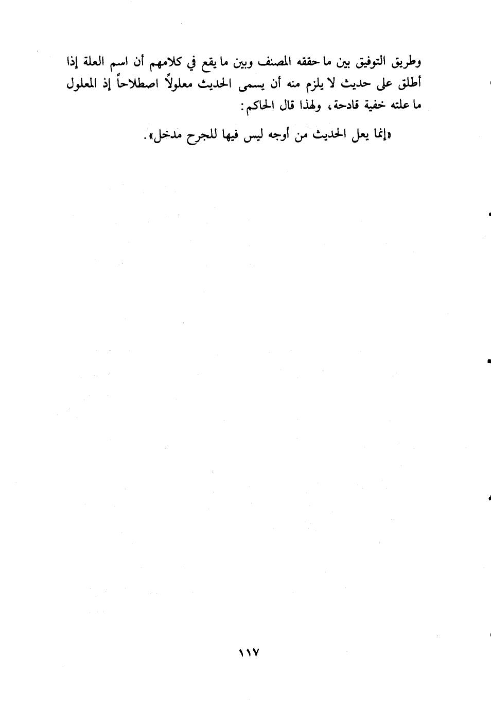 وطريق التوفيق بين ما حققه المصنف وبين ما يقع في كلامهم أن اسم العلة إذا أطلق على حديث لا يلزم منه أن يسمى الحديث معلولا اصطلاحا؛ إذ المعلول ما علته خفية قادحة"، ولهذا قال الحاكم: "إنما يعل الحديث من أوجه ليس فيها للجرح مدخل".
