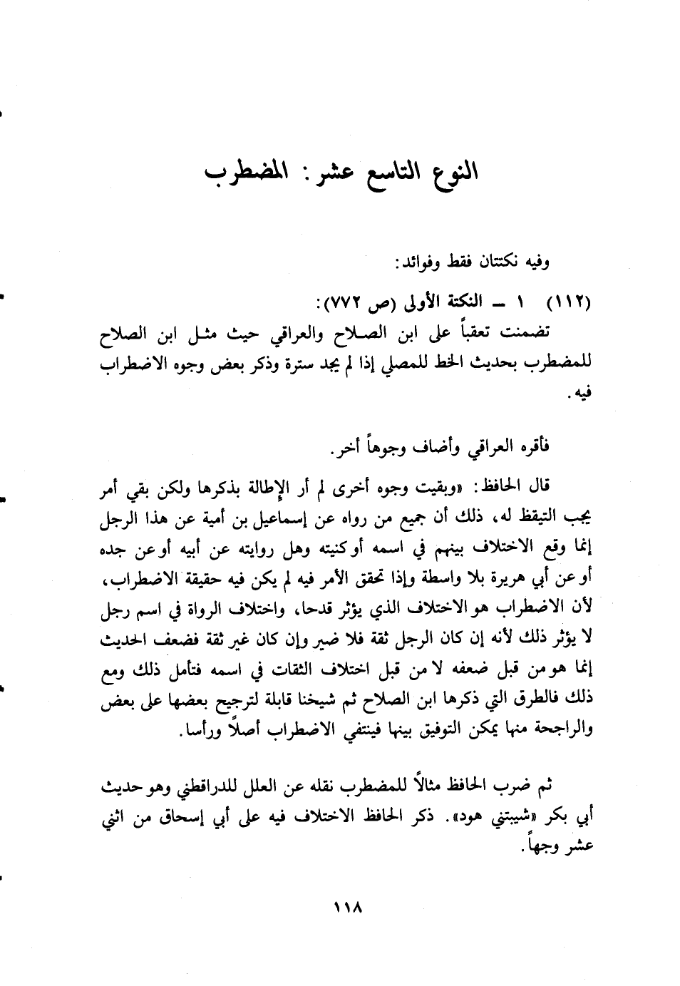 تضمنت تعقبا على ابن الصلاح والعراقي حيث مثل ابن الصلاح للمضرب بحديث الخط للمصلي إذا لم يجد سترة، وذكر بعض وجوه الاضطراب فيه.