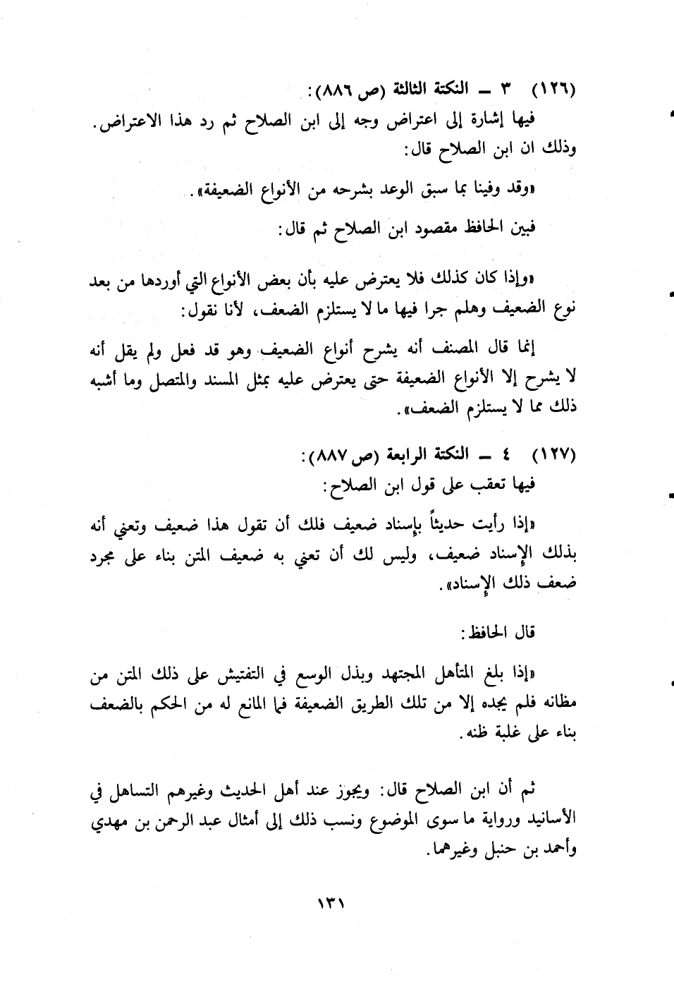 فيها إشارة إلى اعتراض وُجِّه إلى ابن الصلاح ثم رد هذا الاعتراض. وذلك أن ابن ابصلاح قال: "وقد وفينا بما سبق الوعد بشرحه من الأنواع الضعيفة".