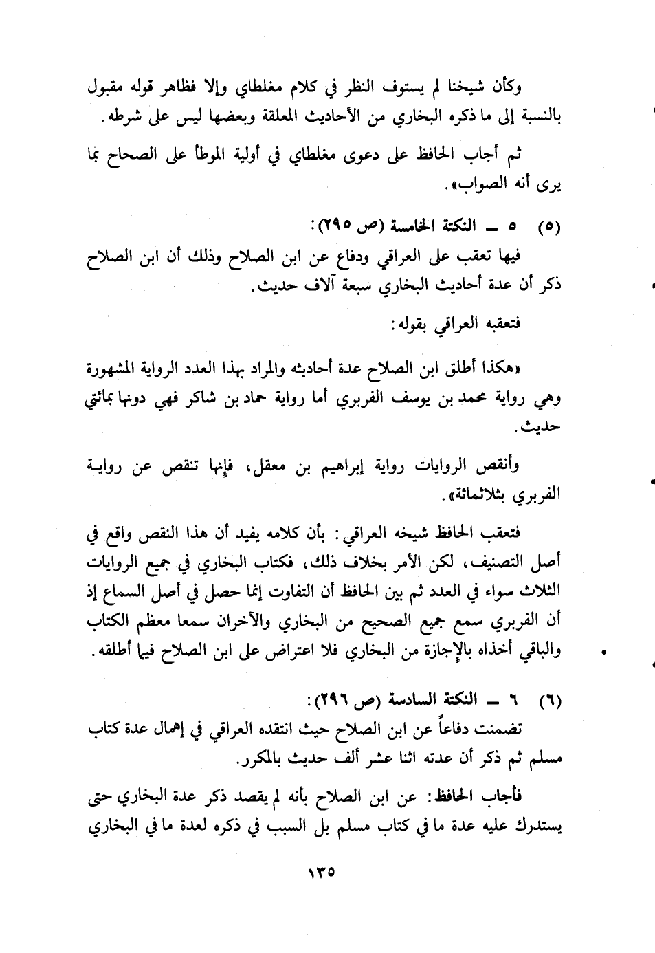 فيها تعقب على العراقي ودفاع عن ابن الصلاح، وذلك أن ابن الصلاح ذكر أن عدة أحاديث البخاري سبعة آلاف حديث.