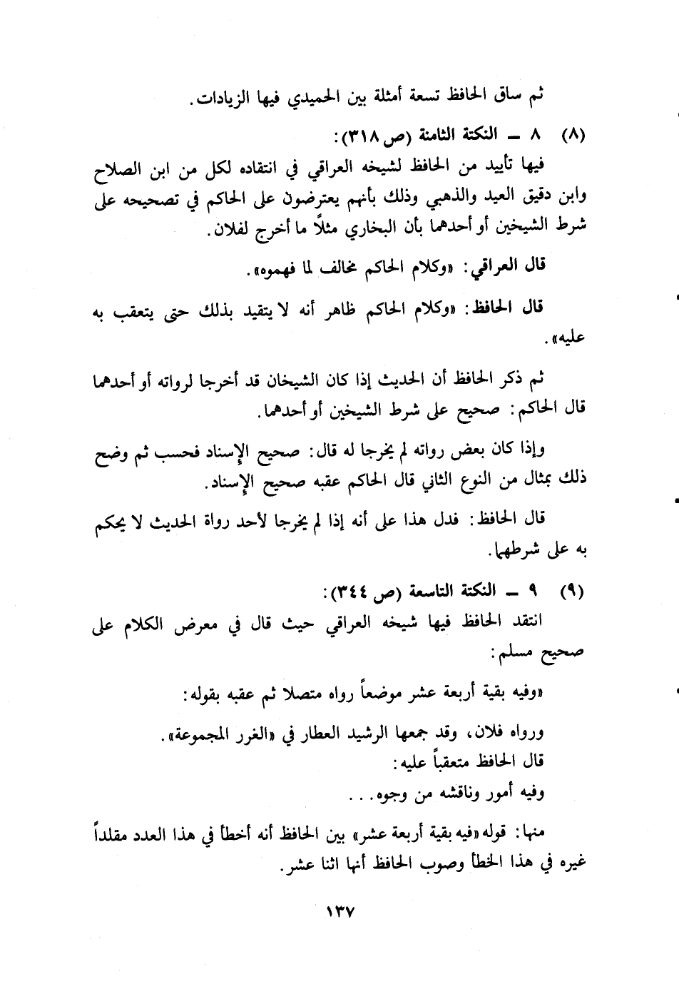 فيها تأييد من الحافظ لشيخه العراقي في انتقاده لكل من ابن الصلاح وابن دقيق العيد والذهبي، وذلك بأنهم يعترضون على الحاكم في تصحيحه على شرط الشيخين أو أحدهما بأن البخاري مثلا ما أخرج لفلان.