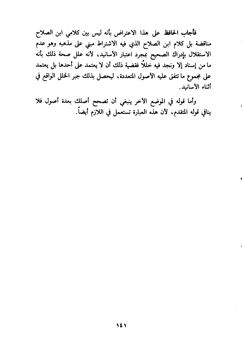 فأجاب الحافظ على هذا الاعتراض بأنه ليس بين كلامي ابن الصلاح مناقضة بل كلام ابن الصلاح الذي فيه الاشتراط مبني على مذهبه، وهو عدم الاستقلال بإدراك الصحيح بمجرد اعتبار الأسانيد، لأنه علّل صحة ذلك بأنه ما من إسناد إلا ونجد فيه خللا، فقضية ذلك أن لا يعتمد على أحدها بل يعتمد على مجموع ما تتفق عليه الأصول المتعددة، ليحصل بذلك جبر الخلل الواقع في أثناء الأسانيد.
