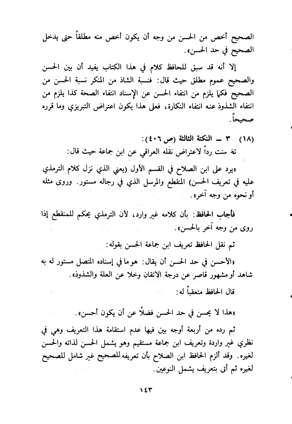 ثم ردّه من أربعة أوجه بين فيها عدم استقامة هذا التعريف وهي في نظري غير واردة وتعريف ابن جماعة مستقيم ويشمل الحسن لذاته والحسن لغيره. وقد ألزم الحافظ ابن الصلاح بأن تعريفه للصحيح غير شامل للصحيح لغيره ثم أتى بتعريف يشمل النوعين.