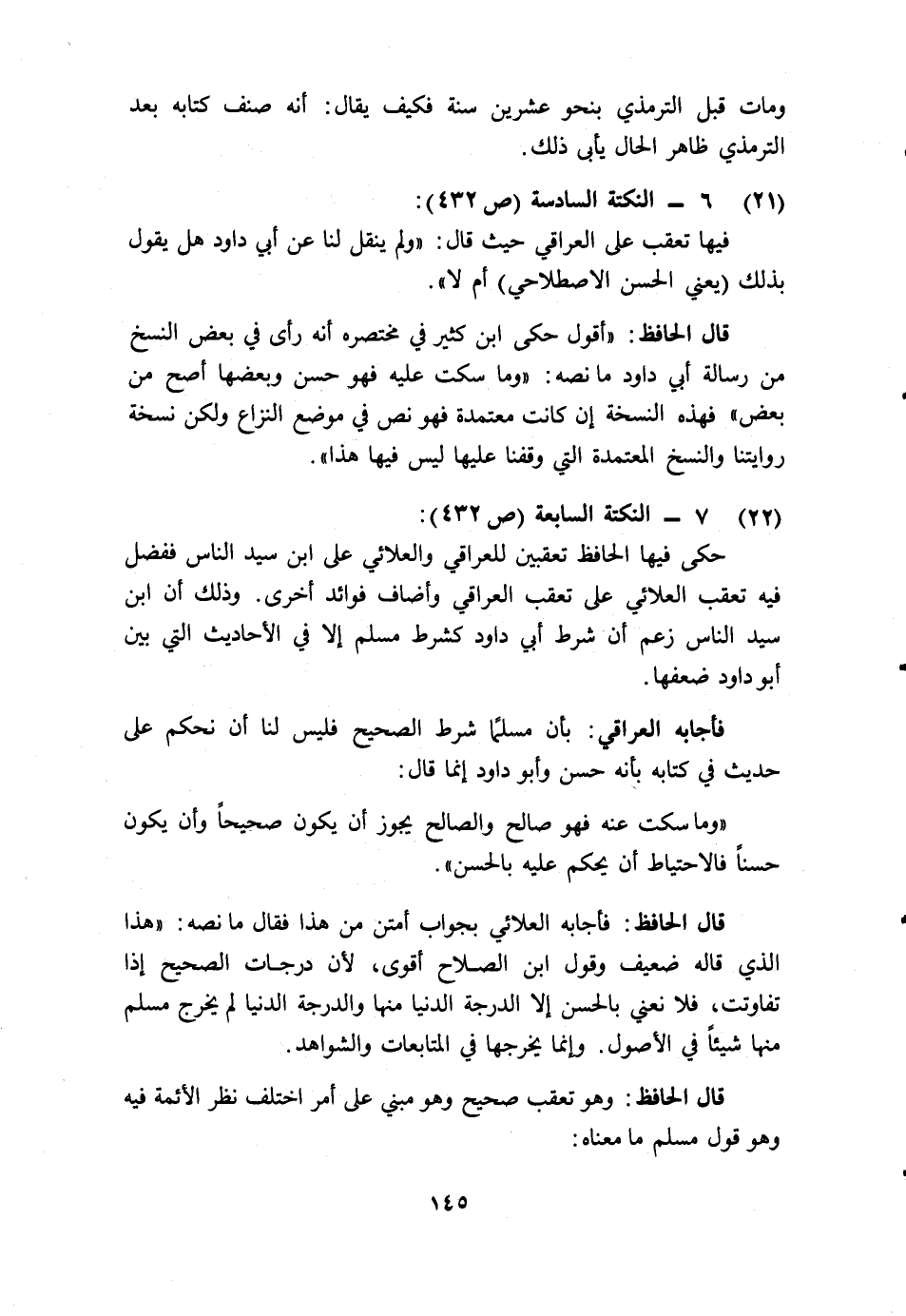 حكى فيها الحافظ تعقبين للعراقي والعلائي على ابن سيد الناس، ففضل فيه تعقب العلائي على تعقب العراقي وأضاف فوائد أخرى. وذلك أن ابن سيد الناس زعم أن شرط أبي داود كشرط مسلم إلا في الأحاديث التي بين أبو داود ضعفها.