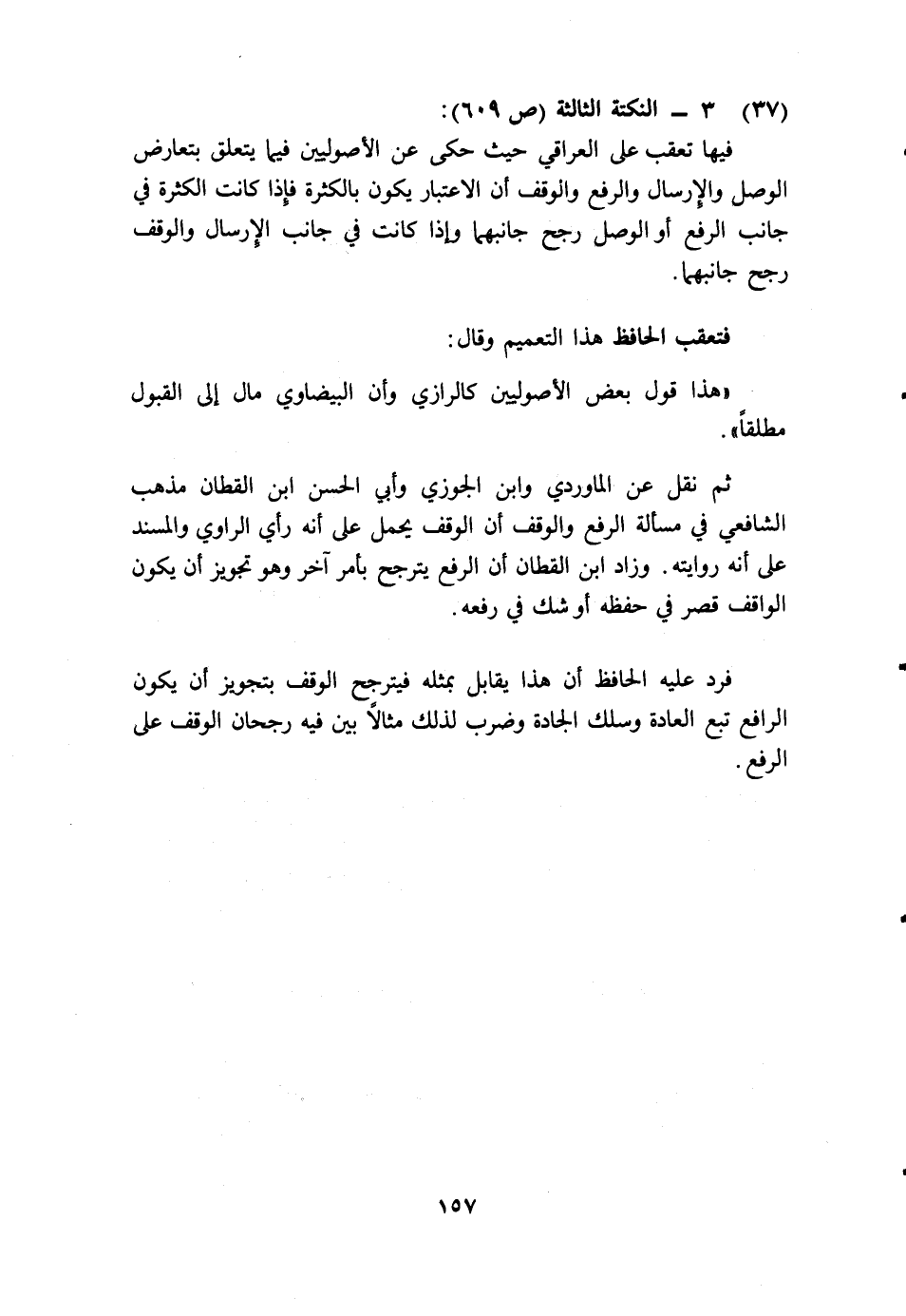 فيها تعقب على العراقي حيث حكى عن الأصوليين فيما يتعلق بتعارض الوصل والإرسال والرفع والوقف أن الاعتبار يكون بالكثرة، فإذا كانت الكثرة في جانب الرفع أو الوصل رجح جانبهما، وإذا كانت في جانب الإرسال والوقف رجح جانبهما.
