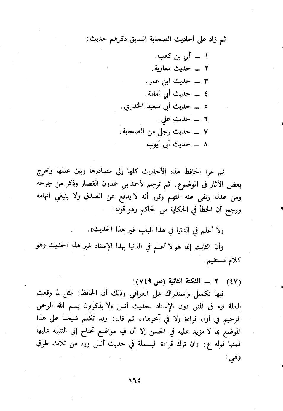 فيها تكميل واستدراك على العراقي وذلك أن الحافظ: مثل لما وقعت العلة فيه في المتن دون الإسناد بحديث أنس: "لا يذكرون بسم الله الرحمن الرحيم في أول القراءة ولا في آخرها"، ثم قال: وقد تكلم شيخنا على هذا الموضع بما لا مزيد عليه في الحسن، إلا أن فيه مواضع تحتاج إلى تنبيه عليها فمنها قوله: "إن ترك قراءة البسملة في حديث أنس ورد من ثلاث طرق وهي: