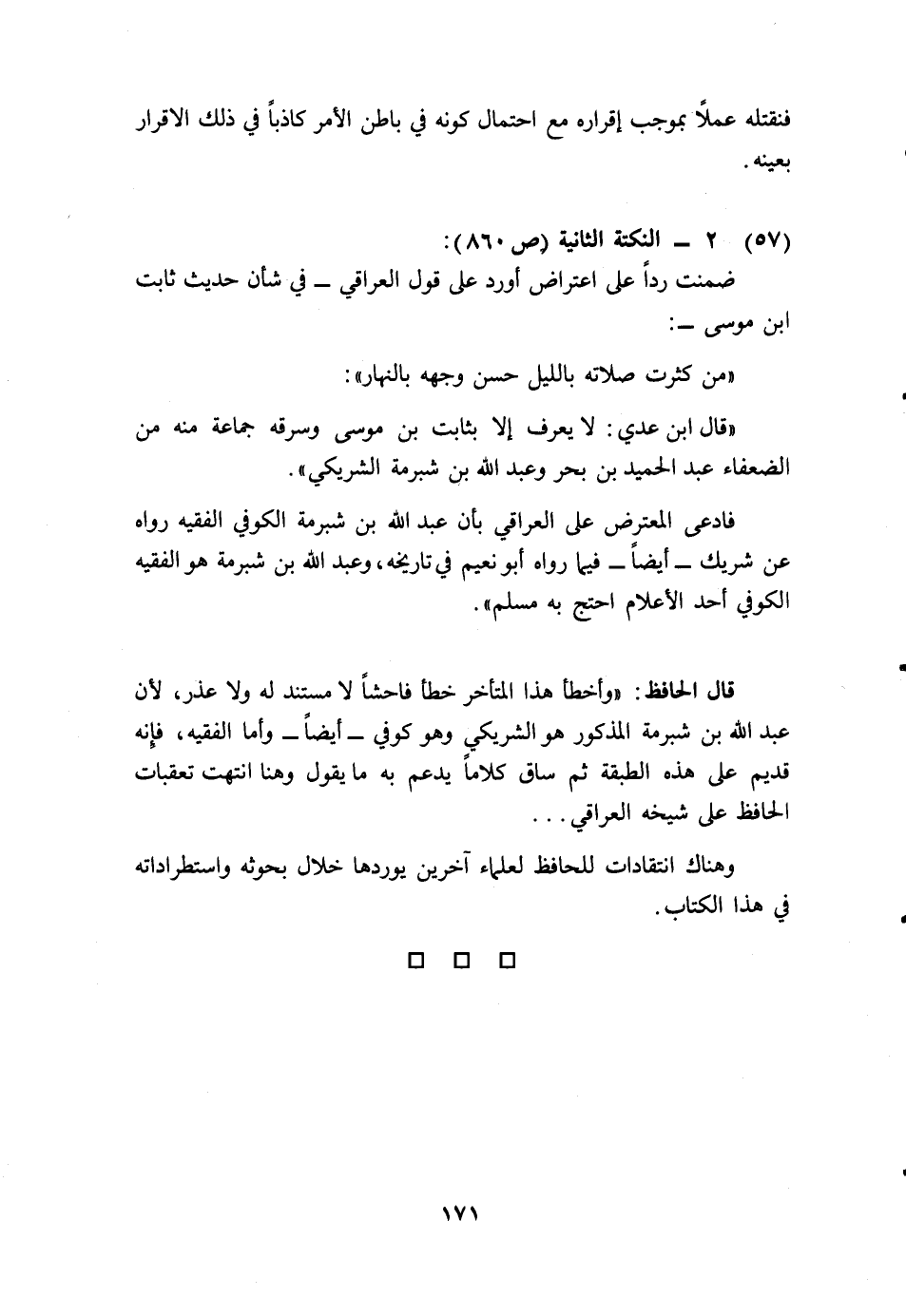 فادعى المعترض على العراقي بأن عبد الله بن شبرمة الكوفي الفقيه رواه عن شريك أيضا فيما رواه أبو نعيم في تاريخه، وعبد اله بن شبرمة هو الفقيه الكوفي أحد الأعلام احتج به مسلم".