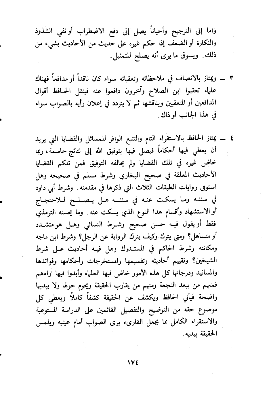 4- يمتاز الحافظ بالاستقراء التام والتتبع الوافر للمسائل والقضايا التي يريد أن يعطي فيها أحكاما، فيصل فيها بتوفيق الله إلى نتائج حاسمة، ربما خاض غيره في تلك القضايا ولم يحالفه التوفيق، فمن تلكم القضايا الأحاديث المعلقة في صحيح البخاري وشرط مسلم في صحيحه، وهل استوفى روايات الطبقات الثلاث التي ذكرها في مقدمته. وشرط أبي داود في سننه، وما يسكت عنه في سننه، هل يصلح للاحتجاج أو الاستشهاد، وأقسام هذا النوع الذي يسكت عنه. وما يحسنه الترمذي فقط أو يقول فيه حسن صحيح، وشرط النسائي، وهل هو متشدد أو متساهل؟ ومتى يترك وكيف يترك الرواية عن الرجل؟ وشرط ابن ماجة ومكانته، وشرط الحاكم في المستدرك، وهل فيه أحاديث على شرط الشيخين؟ وتقييم أحاديثه وتقسيمها والمستخرجات وأحكامها وفوائدها، والمسانيد ودرجاتها، كل هذه الأمور خاض فيها العلماء وأبدوا فيها آراءهم، فمنهم من يبعد النجعة، ومنهم منن يقارب الحقيقة ويحوم حولها ولا يبديها واضحة، فيأتي الحافظ ويكشف عن الحقيقة كشفا كاملا، ويعطي كل موضوع حقه من التوضيح والتفصيل القائمين على الدراسة المستوعبة والاستقراء الكامل، مما يجعل القارئ يرى الصواب أمام عينيه ويلمس الحقيقة بيديه.