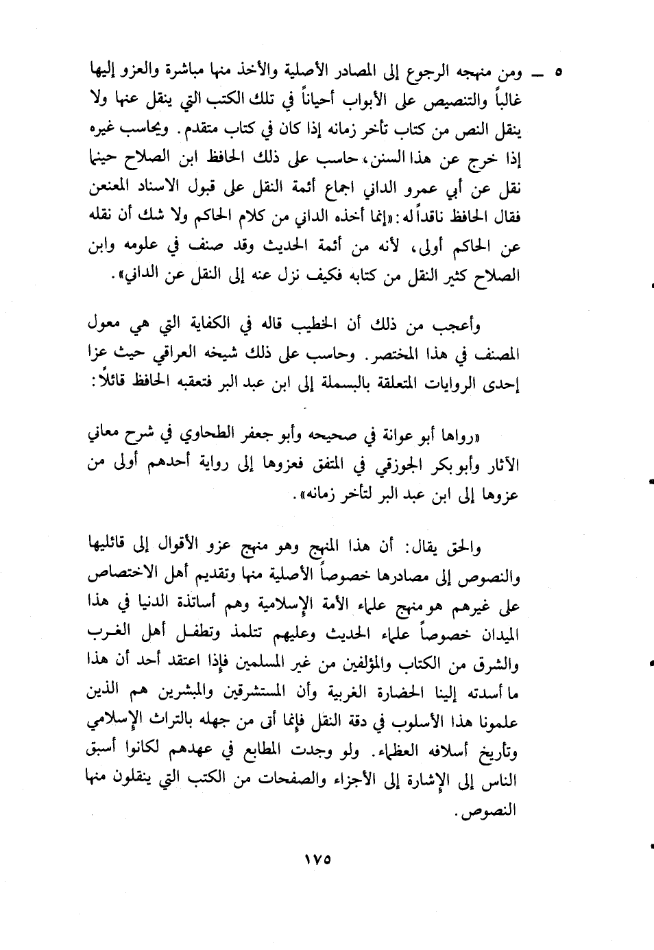 والحق يقال: "إن هذا المنهج وهو منهج عزو الأقوال إلى قائليها والنصوص إلى مصادرها خصوصا الأصلية منها وتقديم أهل الاختصاص على غيرهم هو منهج علماء الأمة الإسلامية، وهم أساتذة الدنيا في هذا الميدان، خصوصا علماء الحديث وعليهم تتلمذ وتتطفل أهل الغرب والشرق من الكتاب والمؤلفين من غير المسلمين، فإذا اعتقد أحد أن هذا ما أسدته إلينا الحضارة الغربية، وأن المستشرقين المبشرين هم الذين علمونا هذا الأسلوب في دقة النقل فإنما أتي من جهله بالتراث الإسلامي وتأريخ أسلافه العظماء. ولو وجدت المطابع في عهدهم لكانوا أسبق الناس إلى الإشارة إلى الأجزاء والصفحات من الكتب التي ينقلون منها النصوص".