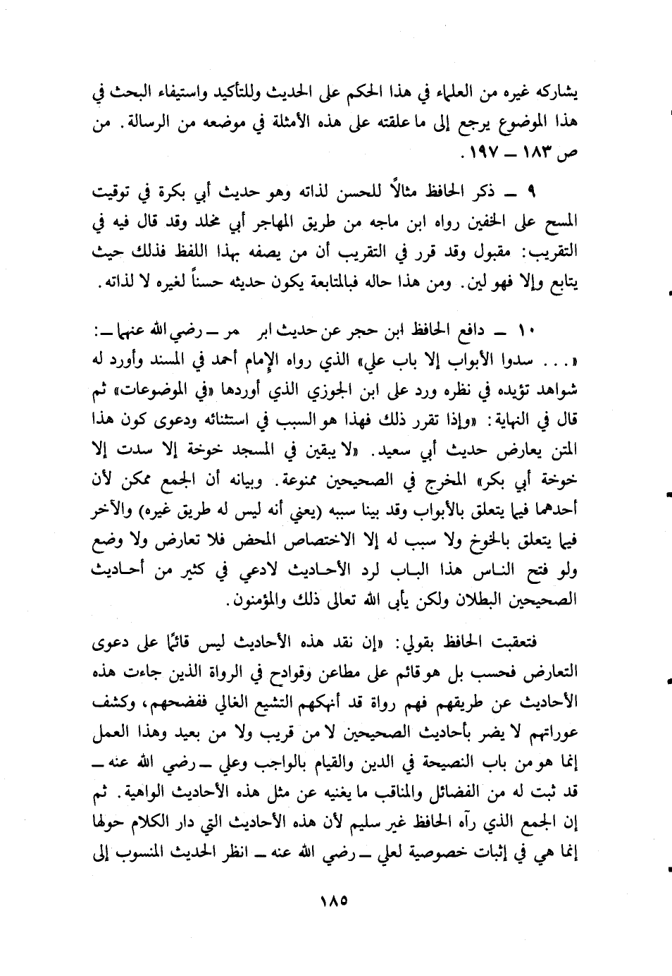 10- دافع الحافظ ابن حجر عن حديث ابن عمر رضي الله عنهما: " ... سدوا الأبواب إلا باب علي" الذي رواه الإمام أحمد في المسند وأورد له شواهد تؤيده في نظره، ورد على ابن الجوزي الذي أوردها في (الموضوعات) ثم قال في النهاية: "وإذا تقرر ذلك فهذا هو السبب في استثنائه، ودعوى كون هذا المتن يعارض حديث أبي سعيد لا يبقين في المسجد خوخة إلا سدت إلا خوخة أبي بكر" المخرج في الصحيحين ممنوعة. وبيانه أن الجمع ممكن لأن أحدهما فيما يتعلق بالأبواب وقد بينا سببه (يعني أنه ليس له طريق غيره) والأخر فيما يتعلق بالخوخ ولا سبب له إلا الاختصاص المحض، فلا تعارض ولا وضع، ولو فتح الناس هذا الباب لرد الأحاديث لادعي في كثير من أحاديث الصحيحين البطلان، ولكن يأبى الله تعالى ذلك والمؤمنون.