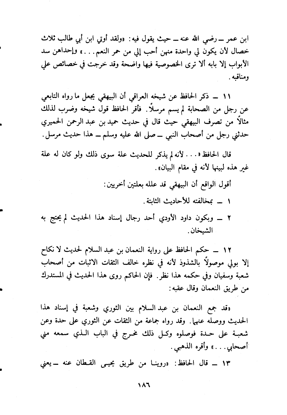 12- حكم الحافظ على رواية النعمان بن عبد السلام لحديث لا نكاح إلا بولي موصولا بالشذوذ لأنه في نظره خالف الثقات الأثبات من أصحاب شعبة وسفيان وفي حكمه هذا نظر. فإن الحاكم روى هذا الحديث في المستدرك من طريق النعمان وقال عقبه: "قد جمع النعمان بن عبد السلام بين الثوري وشعبة في إسناد هذا الحديث ووصله عنهما. وقد رواه جماعة من الثقات عن الثوري على حدة وعن شعبة على حدة فوصلوه، وكل ذلك مخرج في الباب الذي سمعه مني أصحابي ... " وأقره الذهبي.