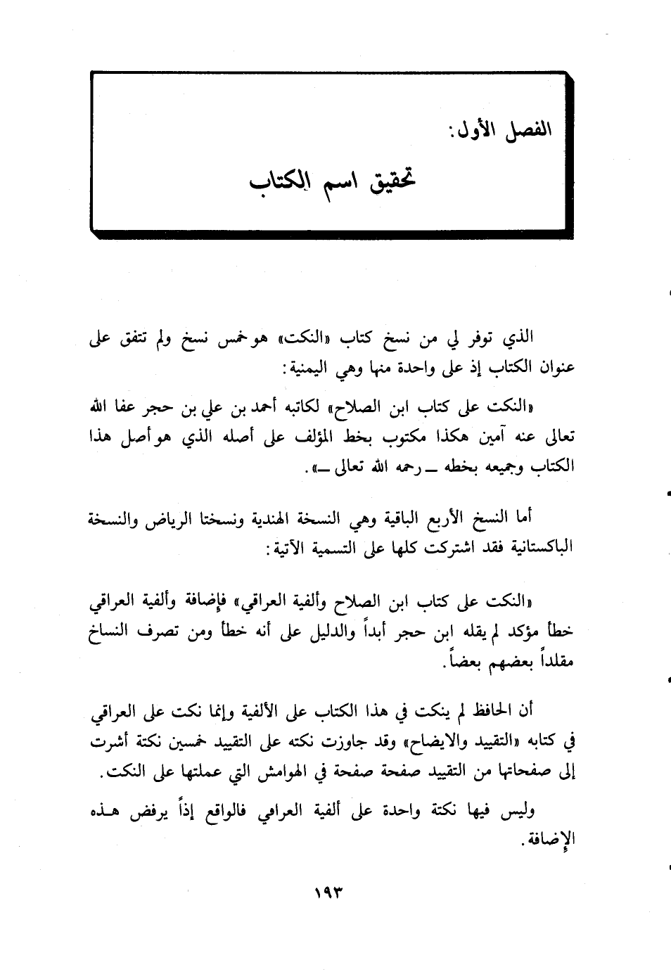(النكت على كتاب ابن الصلاح وألفية العراقي) فإضافة (وألفية العراقي) خطأ مؤكد لم يقله ابن حجر أبدا، والدليل على أنه خطأ ومن تصرف النساخ مقلدا بعضهم بعضا أن الحافظ لم ينكت في هذا الكتاب على الألفية وإنما نكت على العراقي في كتابه (التقييد والإيضاح) وقد جاوزت نكته على التقييد خمسين نكتة أشرت إلى صفحاتها من التقييد صفحة صفحة في الهوامش التي عملتها على النكت. وليس فيها نكتة واحدة على ألفية العراقي فالواقع إذا يرفض هذه الإضافة.
