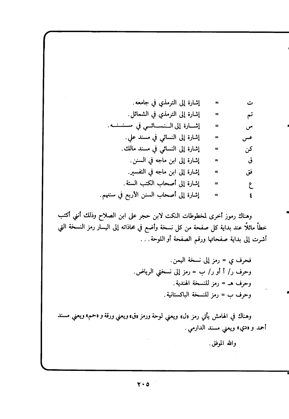 وهناك رموز أخرى لمخطوطات النكت لابن حجر على ابن الصلاح وذلك أنني أكتب خطا مائلا عند بداية كل صفحة من كل نسخة وأضع في محاذاته إلى اليسار رمز النسخة التي أشرت إلى بداية صفحتها ورقم الصفحة أو اللوحة ...
