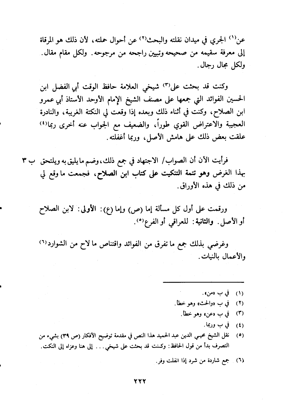 5 نقل الشيخ محي الدين عبد الحميد هذا النص في مقدمة توضيح الأفكار (ص39) بشيء من التصرف بدأ من قول الحافظ: "وكنت قد بحثت على شيخي ... إلى هنا وعزاه إلى النكت".