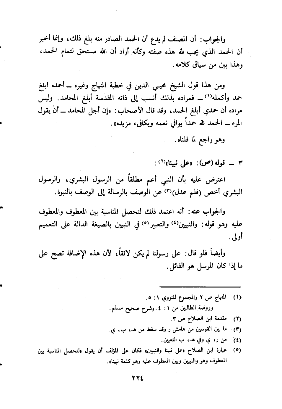 4 عبارة ابن الصلاح (على نبينا والنبيين) فكان على المؤلف أن يقول (لتحصل المناسبة بين المعطوف وهو (والنبيين) والمعطوف عليه وهو كلمة (نبينا) .
