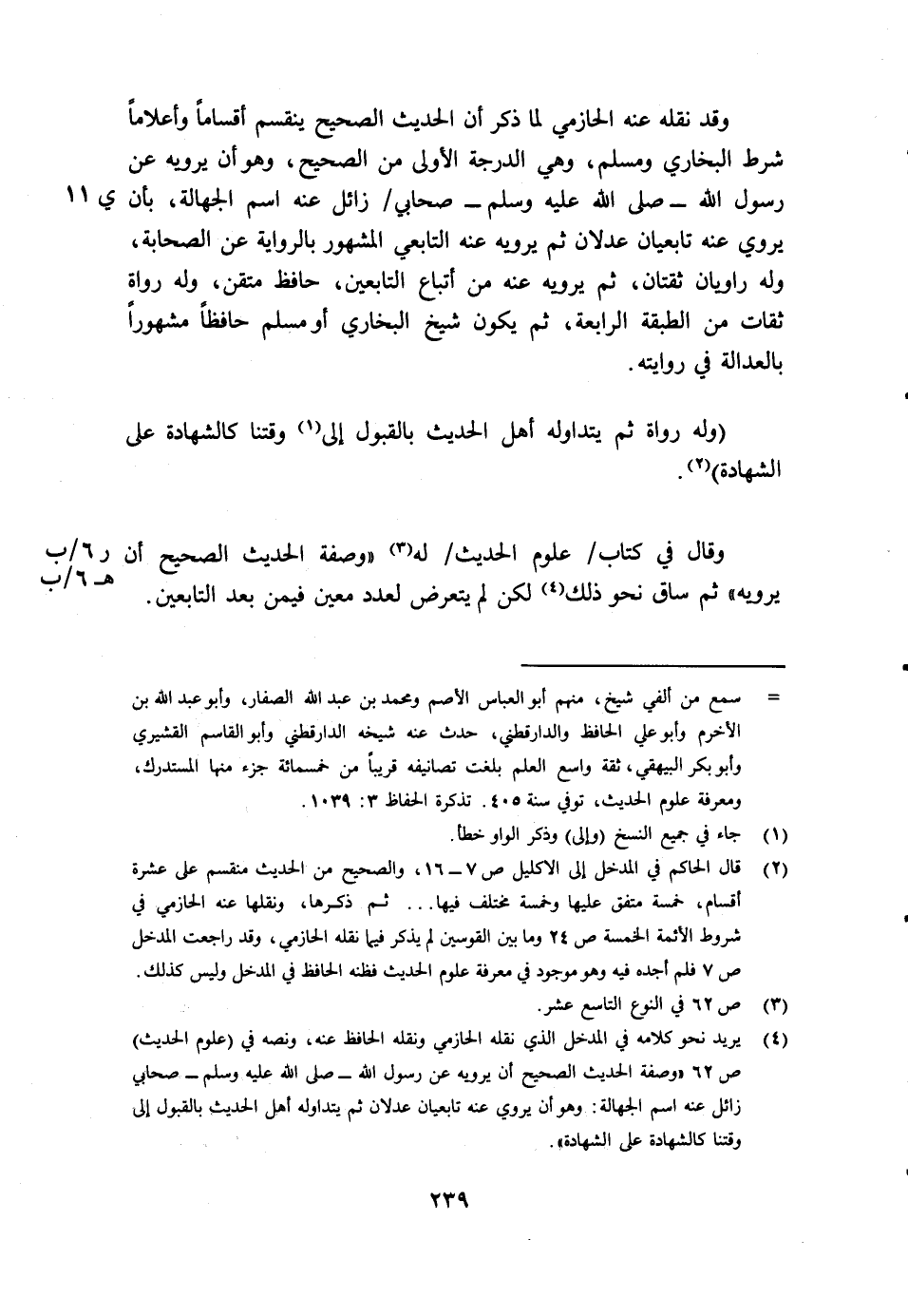 4 يريد نحو كلامه في المدخل الذي نقله الحازمي ونقله الحافظ عنه، ونصه في علوم الحديث ص62: "وصفة الحديث الصحيح أن يرويه عن رسول الله - صلى الله عليه وسلم - صحابي زائل عنه اسم الجهالة وهو أن يروي عنه تابعيان عدلان ثم يتداوله أهل الحديث بالقبول إلى وقتنا كالشهادة على الشهادة".