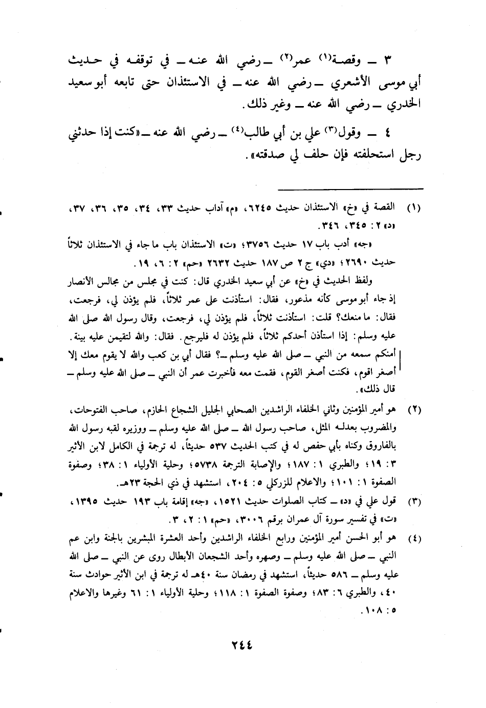 3- وقصة1 عمر2 - رضي الله عنه - في توقفه في حديث أبي موسى الأشعري - رضي الله عنه - في الاستئذان حتى تابعه أبو سعيد الخدري - رضي الله عنه - وغير ذلك.