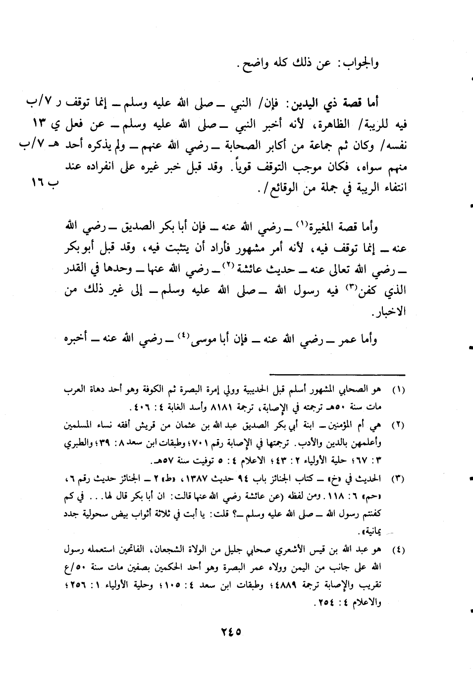 أما قصة ذي اليدين: فإن/ (ر7/ب) النبي - صلى الله عليه وسلم - إنما توقف فيه للريبة/ (ي13) الظاهرة، لأنه أخبر النبي - صلى الله عليه وسلم - عن فعل نفسه/ (?7/ب) وكان ثمة جماعة من أكابر الصحابة - رضي الله عنهم، ولم يذكره أحد منهم سواه، فكان موجب التوقف قويا. وقد قبل خبر غيره على انفراده عند انتفاء الريبة في جملة من الوقائع/ (ب16) .