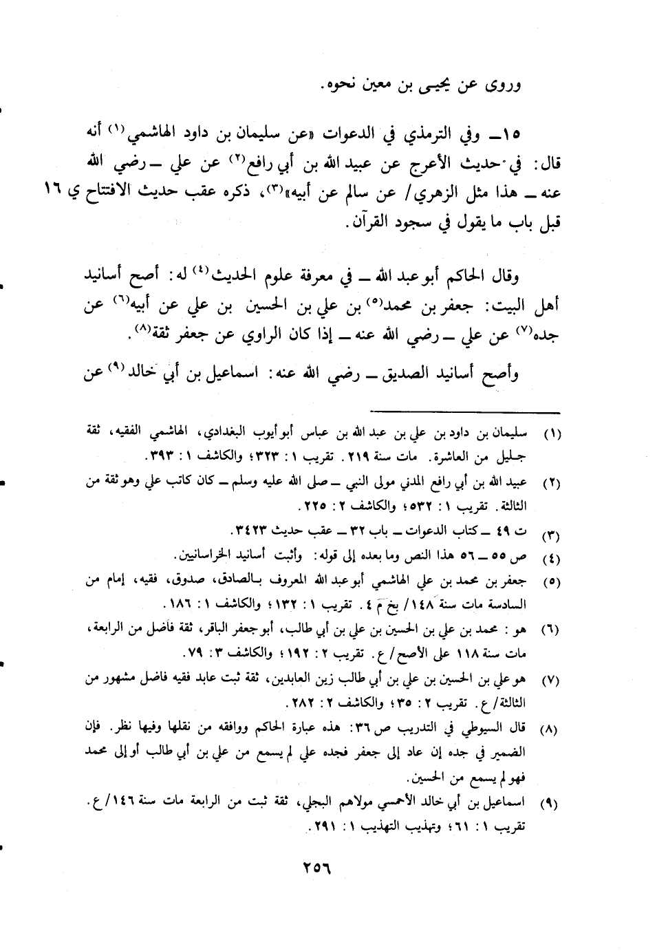 8 قال السيوطي في التدريب ص36: هذه عبارة الحاكم ووافقه من نقلها وفيها نظر. فإن الضمير في جده إن عاد إلى جعفر فجده علي لم يسمع من علي بن أبي طالب أو إلى محمد فهو لم يسمع من الحسين.