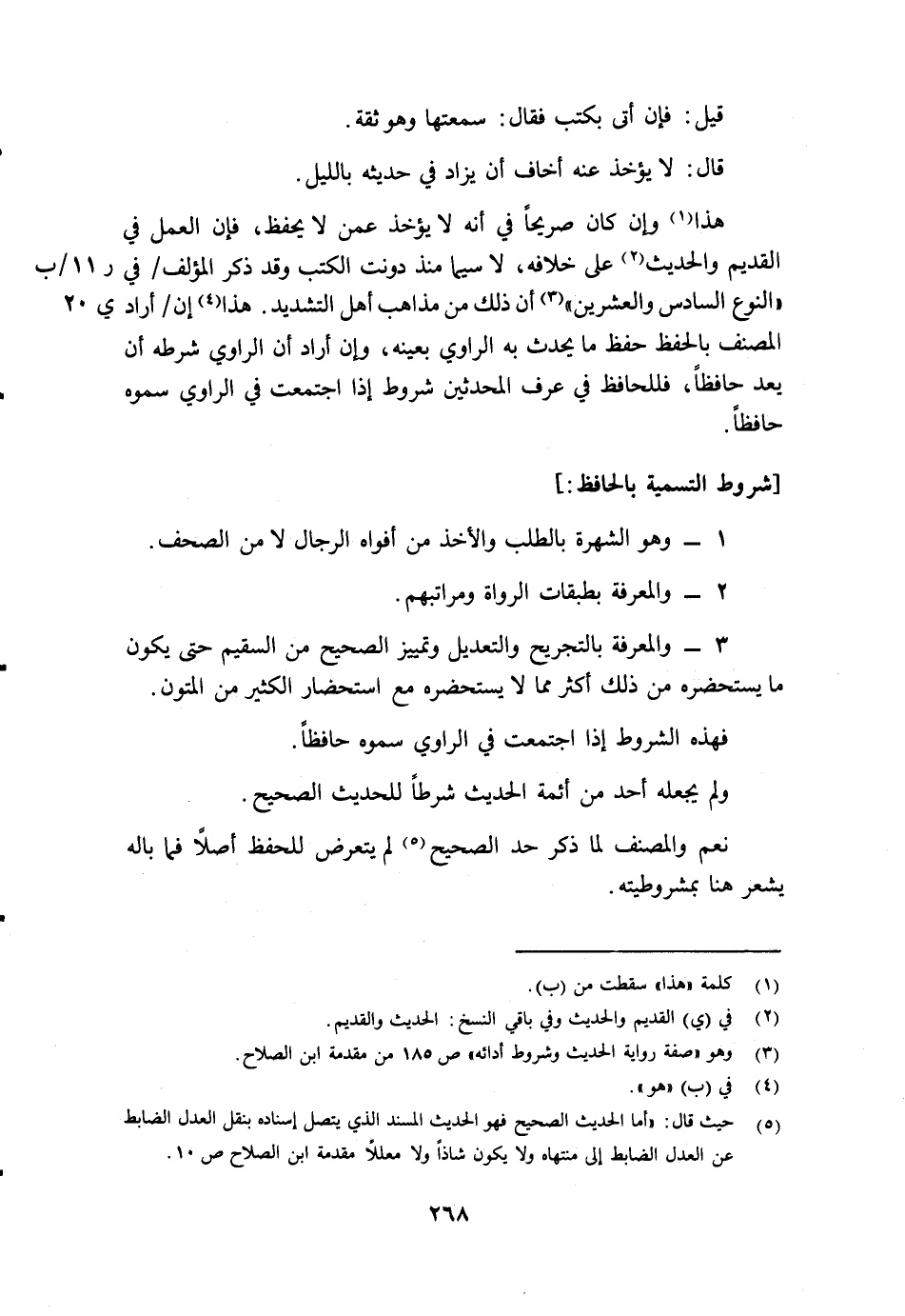 5 حيث قال: "أما الحديث الصحيح فهو الحديث المسند الذي يتصل إسناده بنقل العدل الضابط عن العدل الضابط إلى منتهاه زلا يكون شاذا ولا معللا" مقدمة ابن الصلاح ص10.