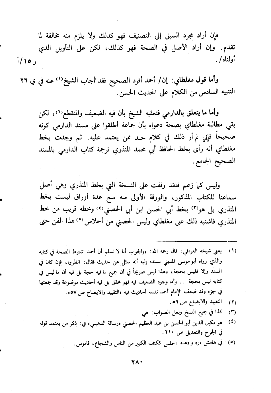 وليس كما زعم، فلقد وقفت على النسخة التي بخط المنذري، وهي أصل سماعنا للكتاب المذكور، والورقة الأولى منه مع عدة أوراق ليست بخط المنذري، بل هو3 بخط أبي الحسن ابن أبي الحصني4، وخطه قريب من خط المنذري، فاشتبه ذلك على مغلطاي وليس الحصني من أحلاس5 هذا الفن حتى
