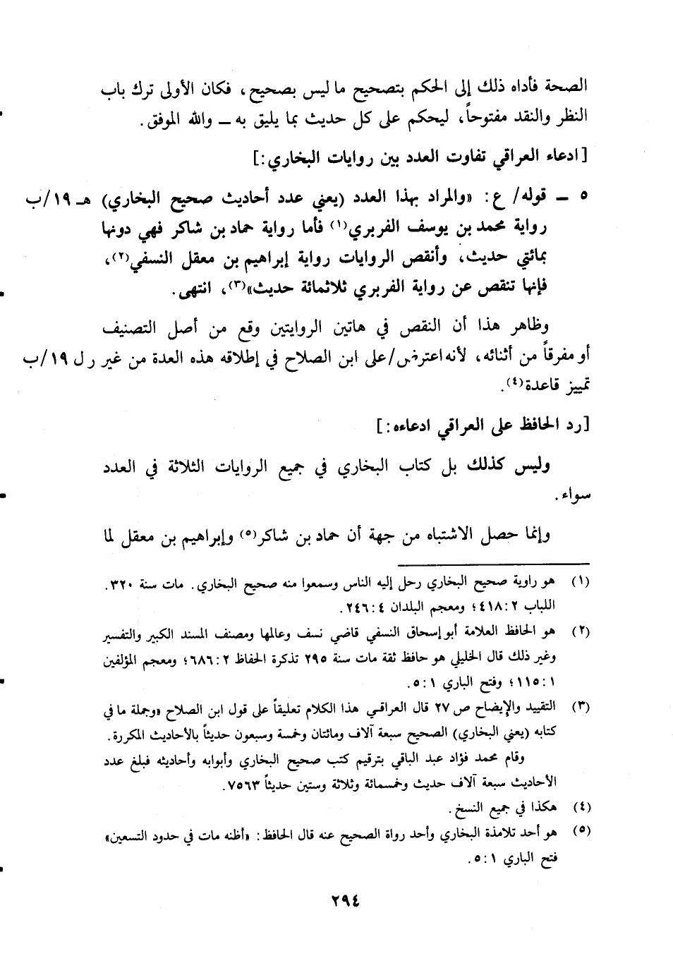 3 التقييد والإيضاح ص27 قال العراقي هذا الكلام تعليقا على قول ابن الصلاح "وجملة ما في كتابه (يعني البخاري) الصحيح سبعة آلاف ومائتان وخمسة وسبعون حديثا بالأحاديث المكررة. وقام محمد فؤاد عبد الباقي بترقيم كتب صحيح البخاري وأبوابه وأحاديثه فبلغ عدد الأحاديث سبعة آلاف حديث وخمسمائة وثلاثة وستين حديثا 7563.