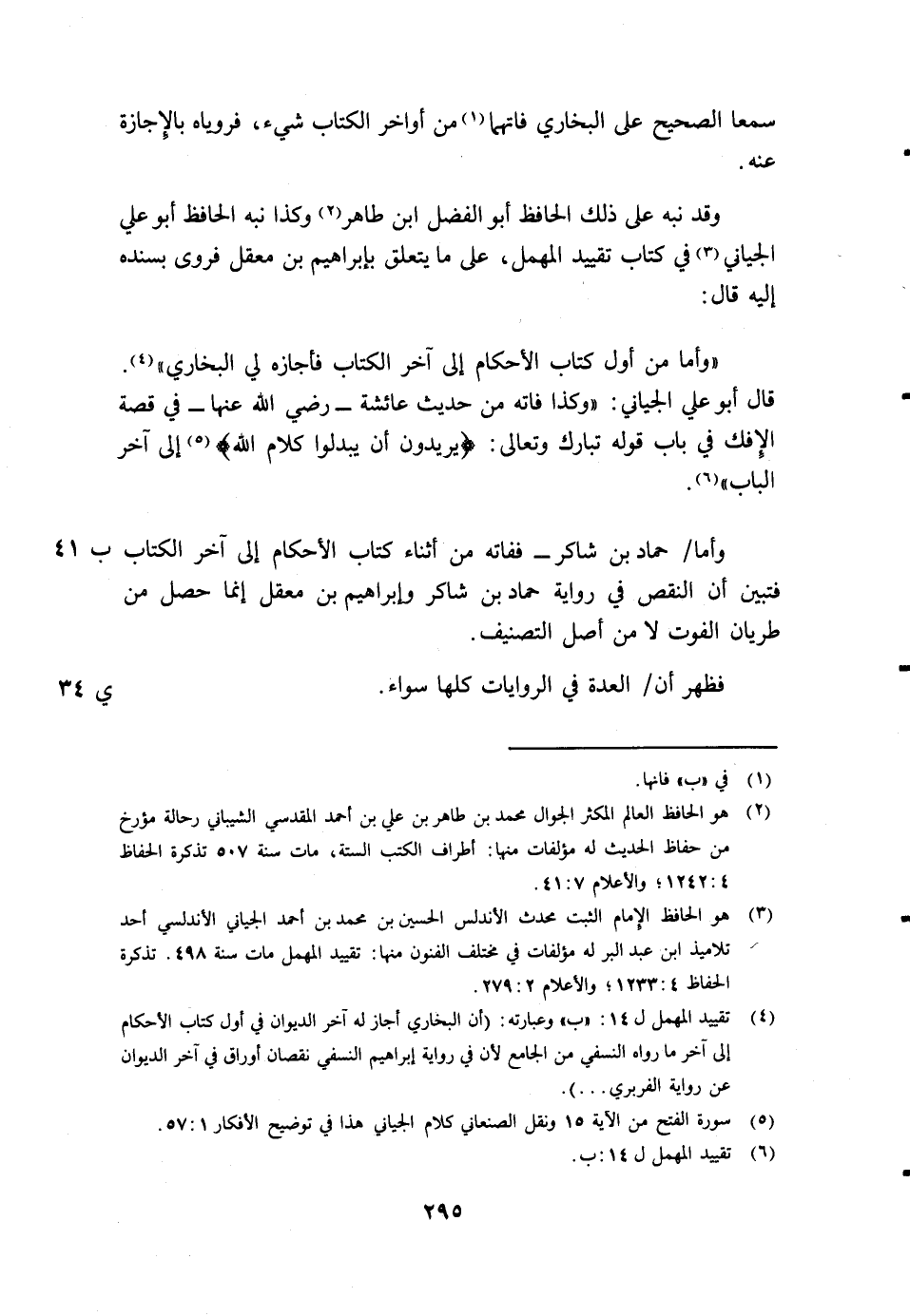4 تقييد المهمل ل14: (ب) وعبارته: "أن البخاري أجاز له آخر الديوان في أول كتاب الأحكام إلى آخر ما رواه النسفي من الجامع لأن في رواية إبراهيم النسفي نقصان أوراق في آخر الديوان عن رواية الفربري ... "