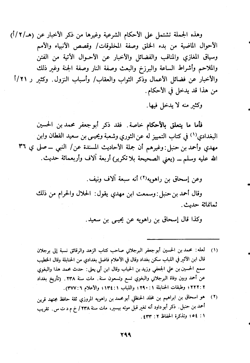 فأما ما يتعلق بالأحكام خاصة. فقد ذكر أبو جعفر محمد بن الحسين البغدادي1 في كتاب التمييز له عن الثوري وشعبة ويحيى بن سعيد القطان وابن مهدي وأحمد بن حنبل وغيرهم: أن جملة الأحاديث المسندة عن/ (ي36) النبي - صلى الله عليه وسلم - يعني الصحيحة بلا تكرير - أربعة آلاف وأربعمائة حديث.