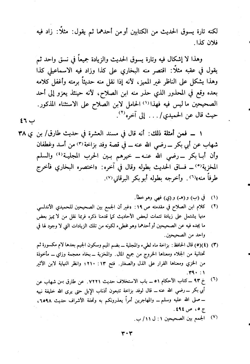 2 كلام ابن الصلاح في مقدمته ص19: "غير أن الجمع للصحيحين للحميدي الأندلسي منها يشتمل على زيادة تتمات لبعض الأحاديث كما قدمنا ذكره، فربما نقل من لا يميز بعض ما يجده فيه عن الصحيحين أو أحدهما وهو مخطئ لكونه من تلك الزيادات التي لا وجود لها في واحد من الصحيحين".