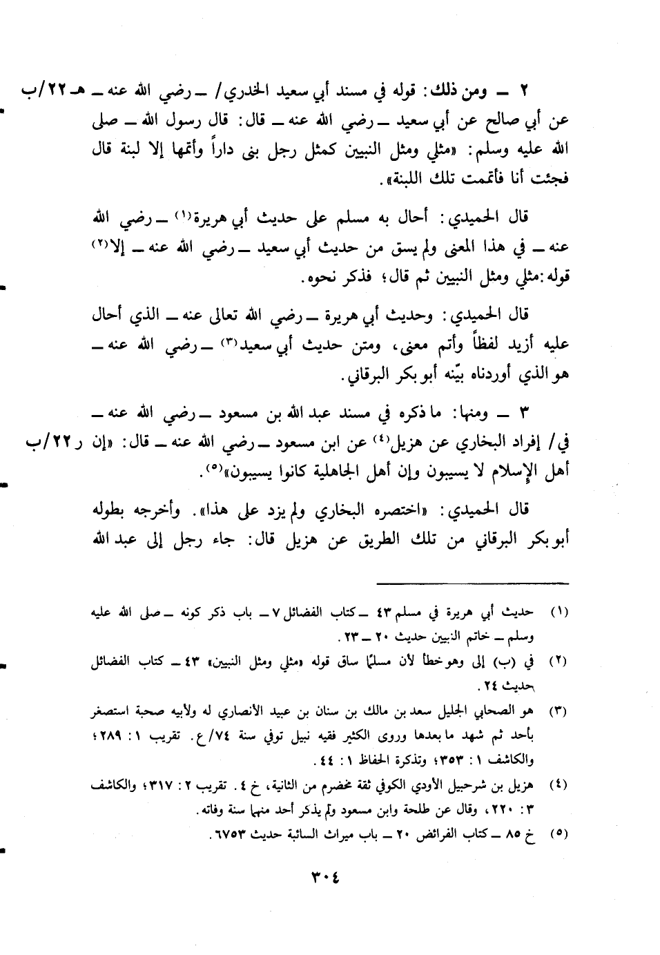 قال الحميدي: "وحديث أبي هريرة - رضي الله تعالى عنه - الذي أحال عليه أزيد لفظا وأتم معنى، ومتن حديث أبي سعيد3 - رضي الله عنه - هو الذي أوردناه بينه أبو بكر البرقاني".