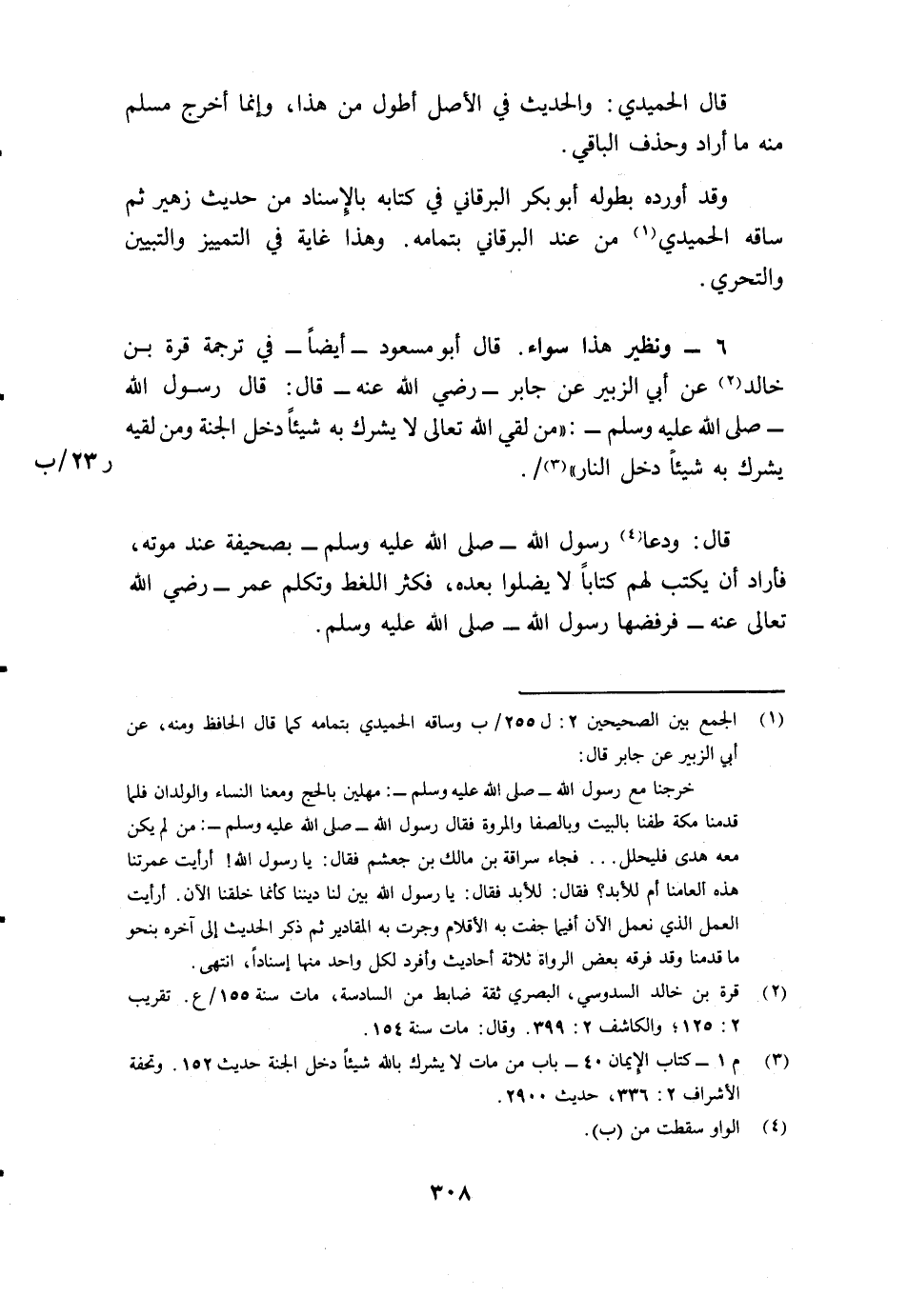 6- ونظير هذا سواء. قال أبو مسعود أيضا في ترجمة قرة بن خالد2 عن أبي الزبير عن جابر - رضي الله عنه - قال: "قال رسول الله - صلى الله عليه وسلم -: "من لقي الله تعالى لا يشرك به شيئا دخل الجنة ومن لقيه يشرك به شيئا دخل النار"3/ (ر23/ب) .