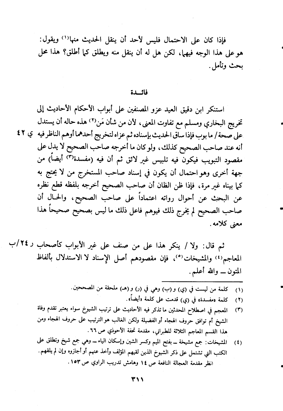 ثم قال: "ولا/ (24/ب) ينكر هذا على من صنف على غير الأبواب كأصحاب المعاجم3 والمشيخات4، فإن مقصودهم أصل الإسناد لا الاستدلال بألفاظ المتون" والله أعلم.