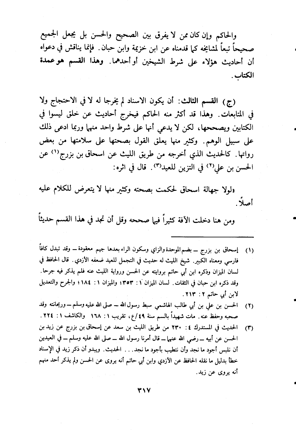 (ج) القسم الثالث: أن يكون الإسناد لم يخرجا له لا في الاحتجاج ولا في المتابعات. وهذا قد أكثر منه الحاكم، فيخرج أحاديث عن خلق ليسوا في الكتابين ويصححها، لكن لا يدعي أنها على شرط واحد منهما، وربما ادعى ذلك على سبيل الوهم. وكثير منها يعلق القول بصحتها على سلامتها من بعض رواتها. كالحديث الذي أخرجه من طريق الليث عن إسحاق بن بزرج1 عن الحسن بن علي2 في التزيين للعيد3. قال في أثره: