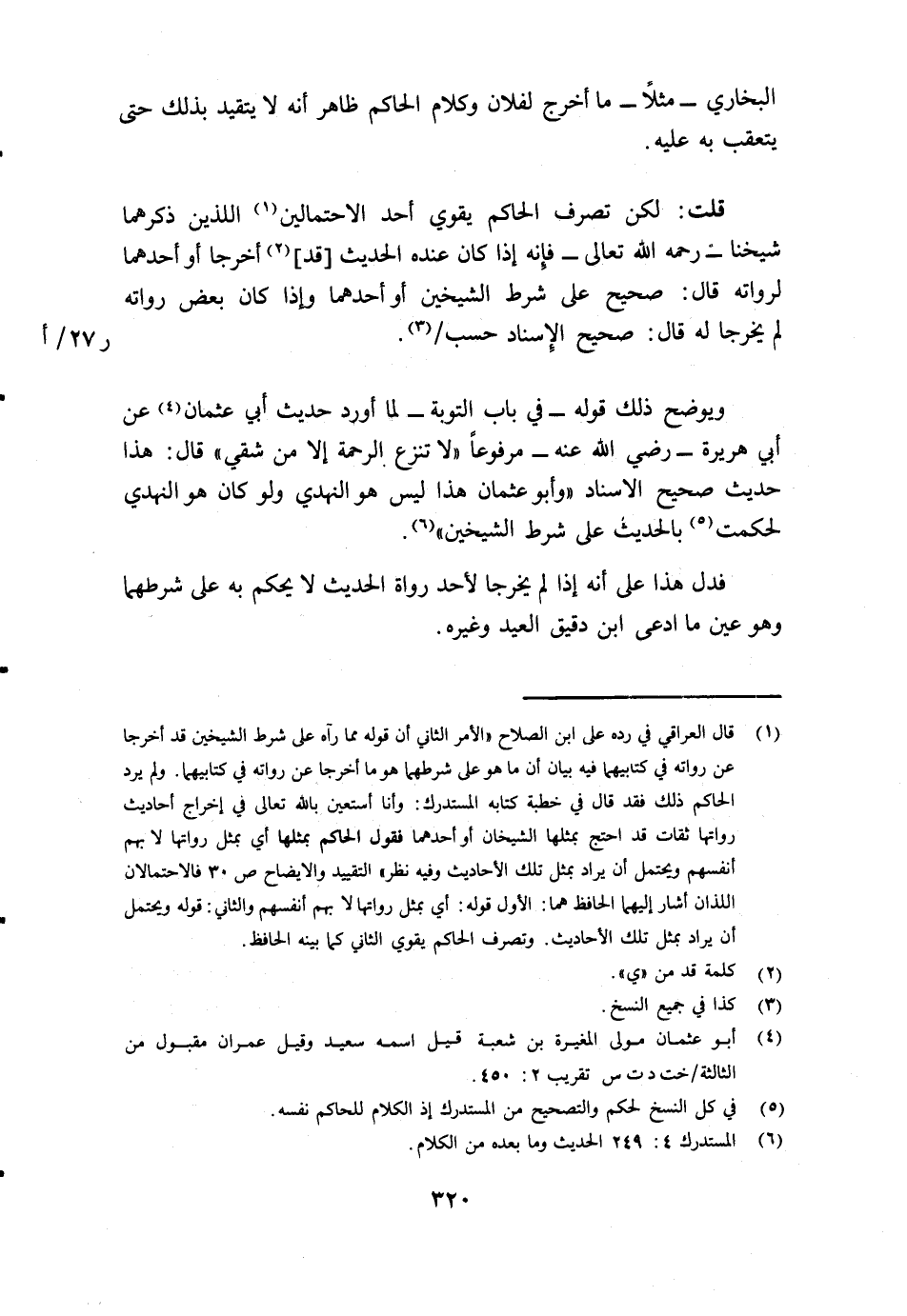 1 قال العراقي في رده على ابن الصلاح: "الأمر الثاني أن قوله مما رآه على شرط الشيخين قد أخرجا عن رواته في كتابيهما فيه بيان أن ما هو على شرطهما هو ما أخرجا عن رواته في كتابيهما. ولم يرد الحاكم ذلك، فقد قال في خطبة كتابه المستدرك: وأنا أستعين بالله تعالى في إخراج أحاديث رواتها ثقات قد احتج بمثلها الشيخان أو أحدهما. فقول الحاكم بمثلها أي بمثل رواتها لا بهم أنفسهم ويحتمل أن يراد بمثل تلك الأحاديث وفيه نظر" التقييد والإيضاح ص30 فالاحتمالان اللذان أشار إليهما الحافظ هما: الأول قوله: أي بمثل رواتها لا بهم أنفسهم. والثاني: قوله ويحتمل أن يراد بمثل تلك الأحاديث. وتصرف الحاكم يقوي الثاني كما بينه الحافظ".