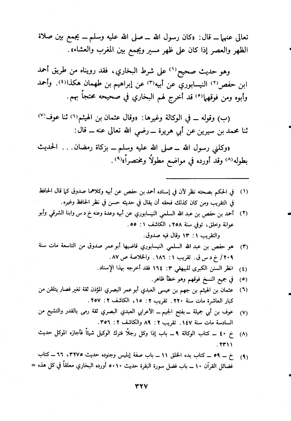 ب- وقوله في الوكالة وغيرها: "وقال عثمان بن الهيثم6 ثنا عوف7 ثنا محمد بن سيرين عن أبي هريرة رضي الله تعالى عنه قال: "وكلني رسول الله - صلى الله عليه وسلم -بزكاة رمضان ... الحديث بطوله8 وقد أورده في مواضع مطولا ومختصرا"9.
