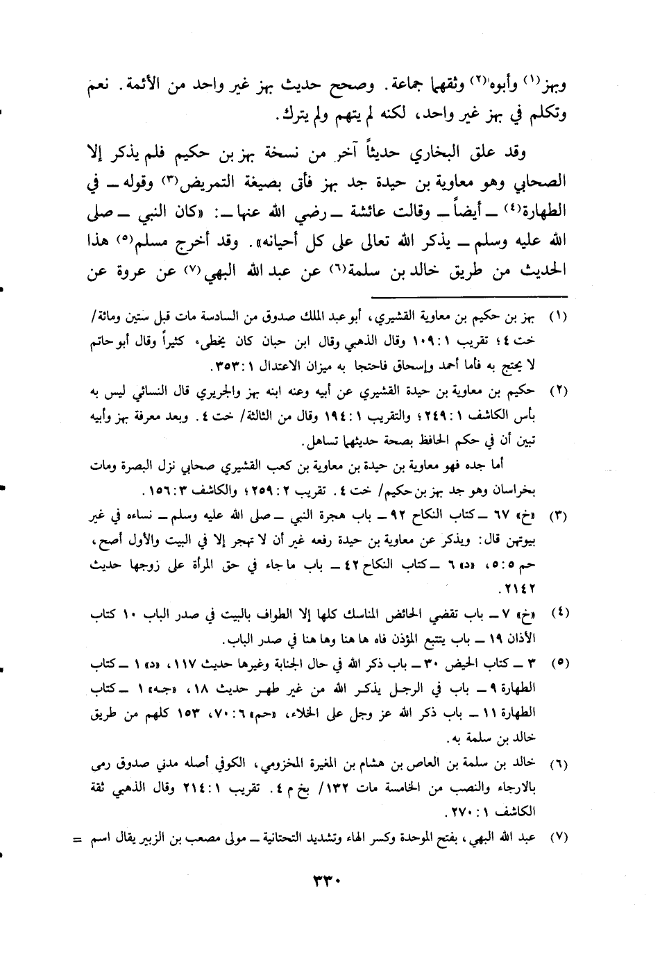 وقد علق البخاري حديثا من نسخة بهز بن حكيم فلم يذكر إلا الصحابي وهو معاوية بن حيدة جد بهز، فأتى بصيغة التمريض3 وقوله في الطهارة4 أيضا وقالت عائشة رضي الله عنها: "كان النبي - صلى الله عليه وسلم - يذكر الله تعالى على كل أحيانه".