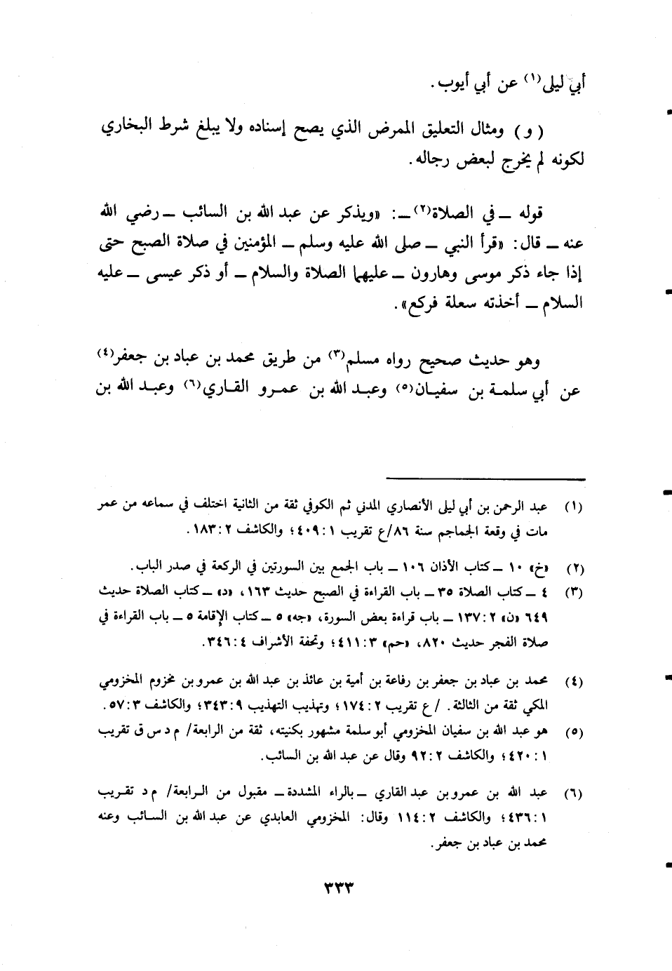 قوله في الصلاة2: "ويذكر ع عبد الله بن السائب رضي الله عنه قال: "قرأ النبي - صلى الله عليه وسلم - المؤمنون في صلاة الصبح حتى إذا جاء ذكر موسى وهارون عليهما السلام أو ذكر عيسى عليه السلام أخذته سعلة فركع".