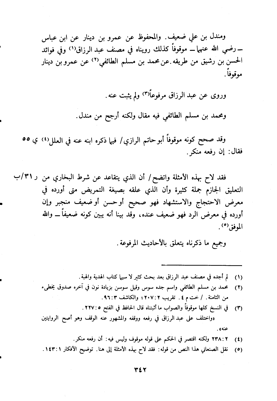 ومندل بن علي ضعيف. والمحفوظ عن عمرو بن دينار عن ابن عباس - رضي الله عنهما - موقوفا كذلك رويناه في مصنف عبد الرزاق1 وفي فوائد الحسن بن رشيق من طريقه، عن محمد بن مسلم الطائفي2 عن عمرو بن دينار موقوفا.