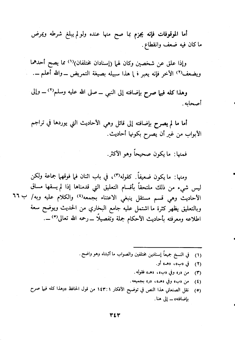 5 نقل الصنعاني هذا النص في توضيح الأفكار 1/143 من قول الحافظ "وهذا كله فيما صرح بإضافته" إلى هنا.
