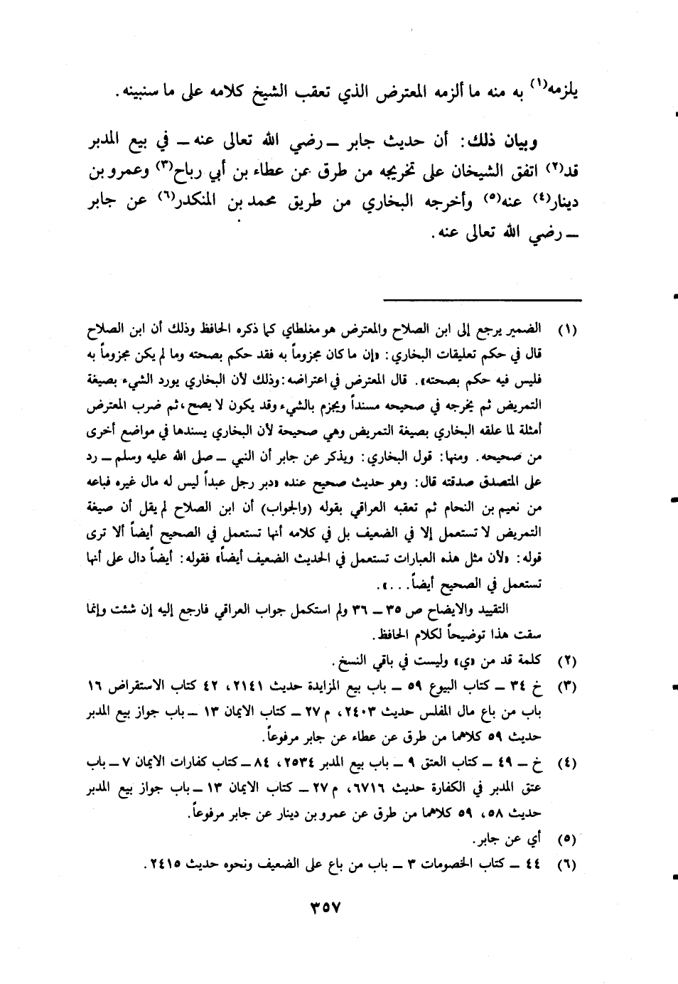 1 الضمير يرجع إلى ابن الصلاح والمعترض هو مغلطاي كما ذكره الحافظ وذلك أن ابن الصلاح قال في حكم تعليقات البخاري: "إن ما كان مجزوما به فقد حكم بصحته، وما لم يكن مجزوما به فليس فيه حكم بصحته". قال المعترض في اعتراضه: وذلك لأن البخاري يورد الشيء بصيغة التمريض، ثم يخرجه في صحيحه مسندا، ويجزم بالشيء وقد يكون لا يصح، ثم ضرب المعترض أمثلة لما علقه البخاري بصيغة التمريض وهي صحيحة لأن البخاري يسندها في مواضع أخرى من صحيحه. ومنها: قول البخاري: ويذكر عن جابر أن النبي - صلى الله عليه وسلم - رد على المتصدق صدقته قال: وهو حديث صحيح عنده "دبر رجل عبدا ليس له مال غيره فباعه من نعيم بن النحام" ثم تعقبه العراقي بقوله (والجواب) أن ابن الصلاح لم يقل إن صيغة التمريض لا تستعمل إلا في الضعيف بل في كلامه أنها تستعمل في الصحيح أيضا ألا ترى قوله: لأن مثل هذه العبارات تستعمل في الحديث الضعيف أيضا" فقوله: "أيضا" دال على أنها تستعمل في الصحيح أيضا ... ".