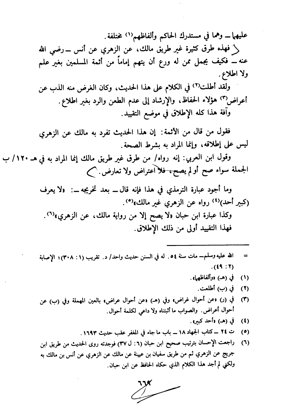6 راجعت الإحسان بترتيب صحيح ابن حبان 6/ل37 فوجدته روى الحديث من طريق ابن جريج عن الزهري ثم من طريق سفيان بن عيينة عن مالك عن الزهري عن أنس بن مالك به ولكني لم أجد هذا الكلام الذي حكاه الحافظ عن ابن حبان.