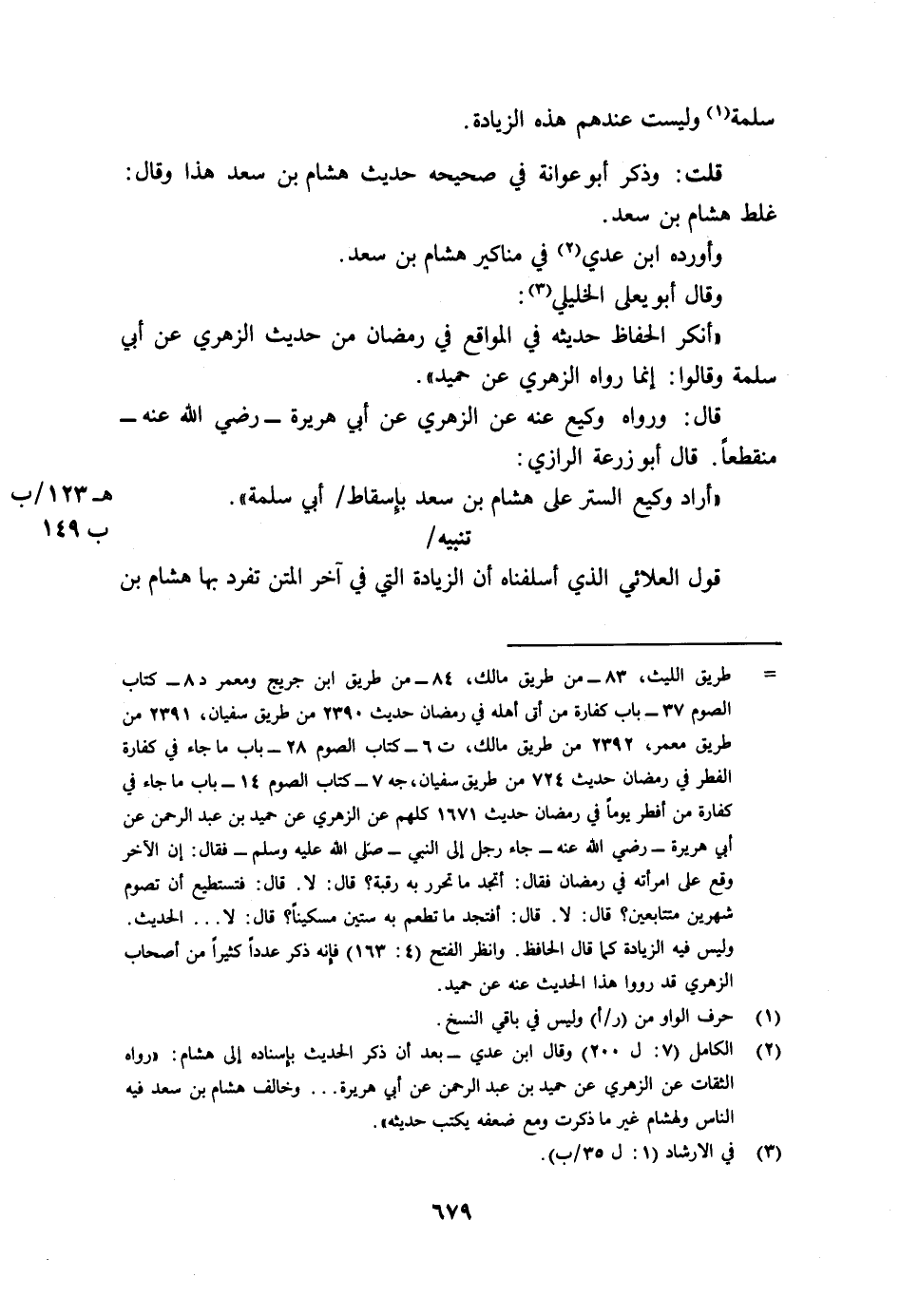 2 االكامل 7/ل 200 وقال ابن عدي - بعد أن ذكر الحديث بإسناده إلى هشام: "رواه الثقات عن الزهري عن حميد بن عبد الرحمن عن أبي هريرة ... وخالف هشام بن سعد فيه الناس، ولهشام غير ما ذكرت ومع ضعفه يكتب حديثه".