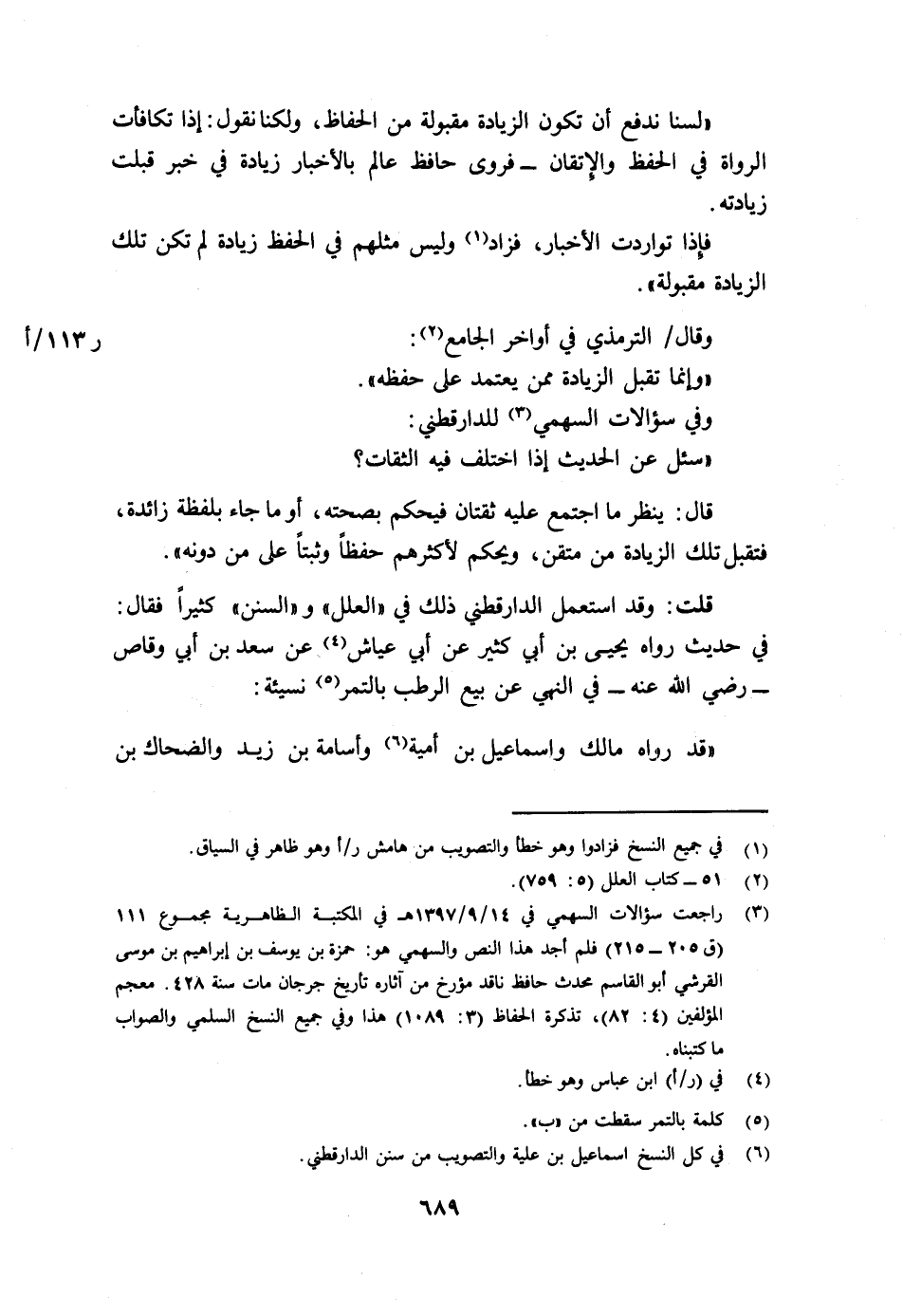3 راجعت سؤالات السهمي في 14/9/1397هـ في المكتبة الظاهرية مجموع 111 (ق 205-215) فلم أجد هذا النص والسهمي هو: حمزة بن يوسف بن إبراهيم بن موسى القرشي أبو القاسم محدث حافظ ناقد مؤرخ من آثاره تأريخ جرجان مات سنة 428 معجم المؤلفين 4/82 تذكرة الحفاظ 3/1089 هذا وفي جميع النسخ السلمي والصواب ما كتبناه (*) .