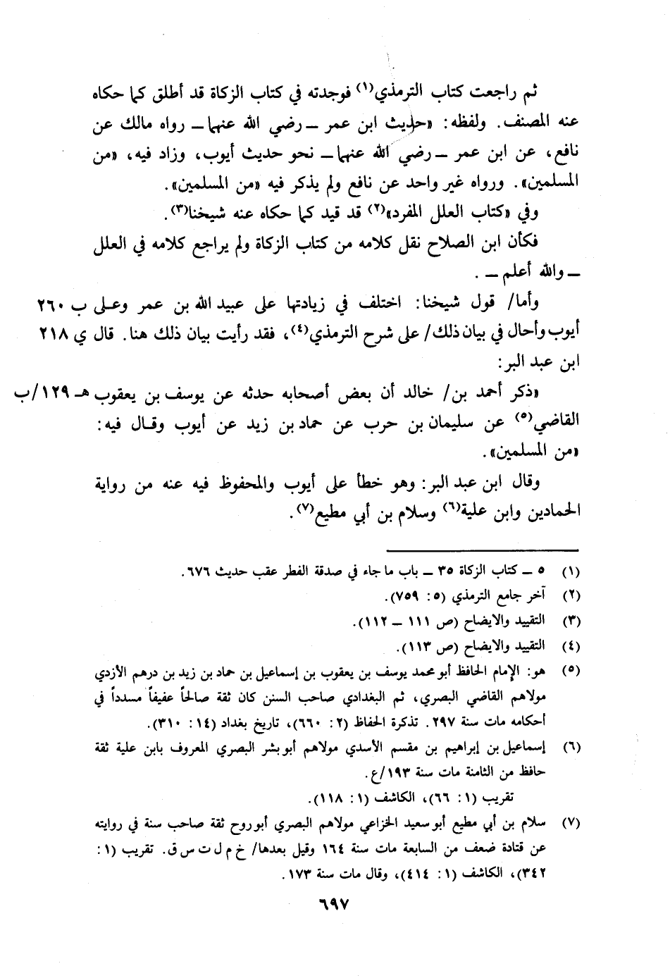 ثم راجعت كتاب الترمذي1 فوجدته في كتاب الزكاة قد أطلق كما حكاه عنه المصنف. ولفظه: "حديث ابن عمر - رضي الله عنهما - رواه مالك عن نافع عن ابن عمر - رضي الله عنهما - نحو حديث أيوب، وزاد فيه، "من المسلمين"، ورواه غير واحد عن نافع ولم يذكر فيه "من المسلمين".