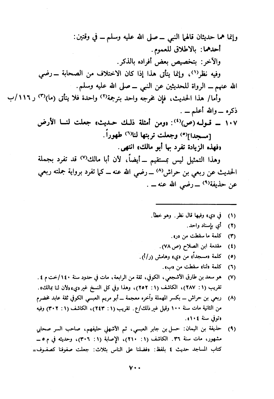 107- قوله (ص) 4: "ومن أمثله ذلك حديث: "جعلت لنا الأرض [مسجدا] 5 وجعلت تربتها لنا6 طهورا". فهذه الزيادة تفرد بها أبو مالك" انتهى.