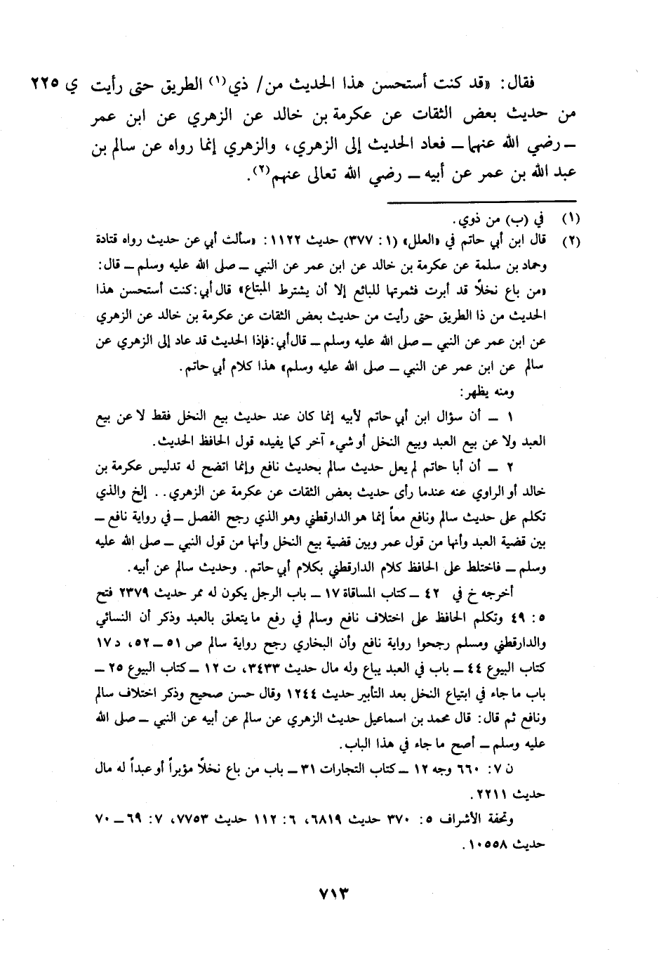 2- أن أبا حاتم لم يعل حديث سالم بحديث نافع، وإنما اتضح له تدليس عكرمة بن خالد أو الراوي عنه عندما رأى حديث بعض الثقات عن عكرمة عن الزهري ... الخ والذي تكلم على حديث سالم ونافع معا إنما هو الدارقطني وهو الذي رجح الفصل- في رواية نافع - بين قضية العبد وأنها من قول عمر وبين قضية بيع النخل وأنها من قول النبي - صلى الله عليه وسلم - فاختلط على الحافظ كلام الدارقطني بكلام أبي حاتم.
