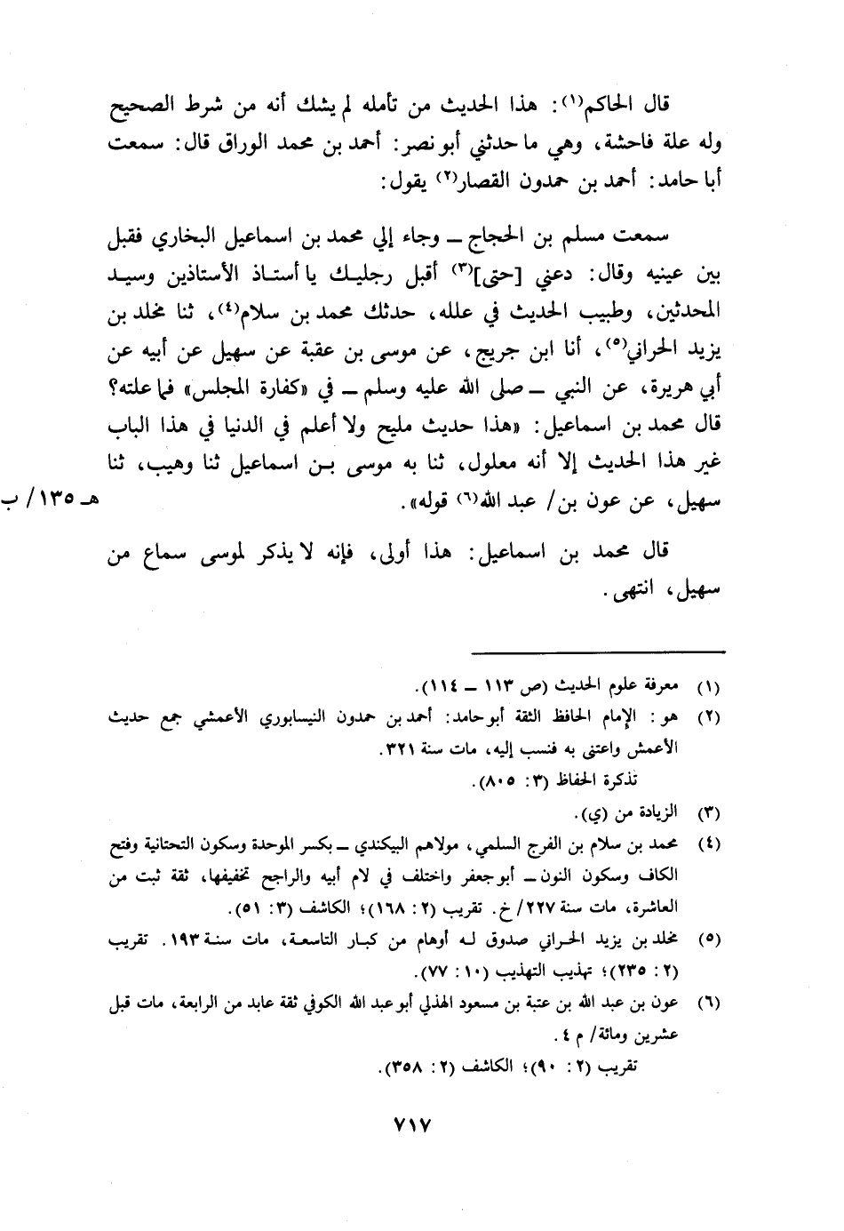 سمعت مسلم بن الحجاج - وجاء إلى محمد بن إسماعيل البخاري فقبل بين عينيه وقال: دعني [حتى] 3 أقبل رجليك يا أستاذ الأستاذين وسيد المحدثين، وطبيب الحديث في علله، حدثك محمد بن سلام 4، ثنا مخلد بن يزيد الحران 5، أنا ابن جريج، عن موسى بن عقبة عن سهيل عن أبيه عن أبي هريرة، عن النبي - صلى الله عليه وسلم - في "كفارة المجلس" فما علته؟ قال محمد بن إسماعيل: "هذا حديث مليح ولا أعلم في الدنيا في هذا الباب غير هذا الحديث إلا أنه معلول، ثنا به موسى بن إسماعيل ثنا وهيب، ثنا سهيل، عن عون هـ 135/ب عبد الله6 قوله".