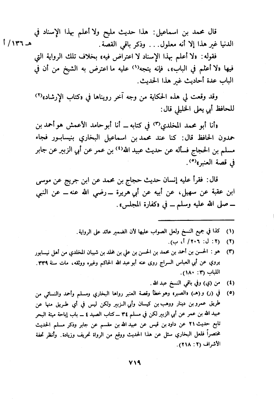 وقد وقعت لي هذه الحكاية من وجه آخر رويناها في "كتاب الإرشاد"2 للحافظ أبي يعلى الخليلي قال: "أنا أبو محمد المخلدي3 في كتابه - أنا أبو حامد الاعمش هو أحمد بن حمدون الحافظ قال: كنا عند محمد بن إسماعيل البخاري بنيسابور فجاء مسلم بن الحجاج فسأله عن حديث عبيد الله 4 بن عمر عن أبي الزبير عن جابر في قصة العنبر"5.